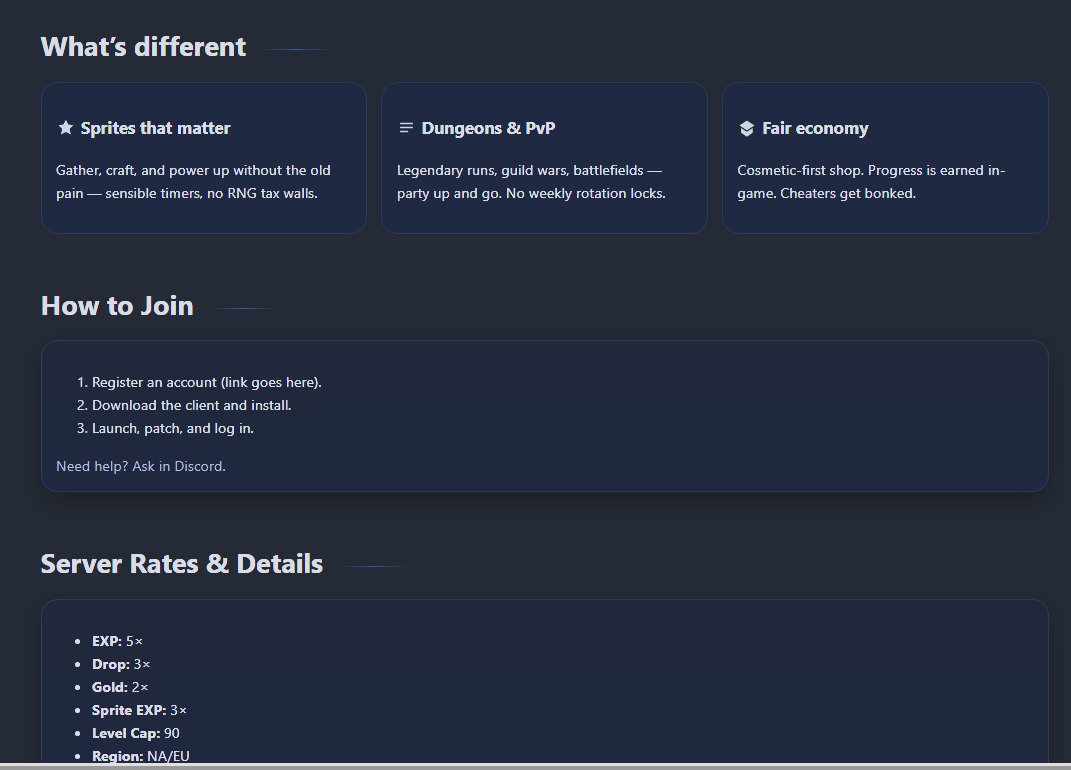 We’re bringing back Saphael with fair play and modern QoL. Balanced classes, boosted but sane rates, GM-run events, and an active Discord. No weekly “dungeon rotations” gimmick — just solid PvE/PvP and community vibes.